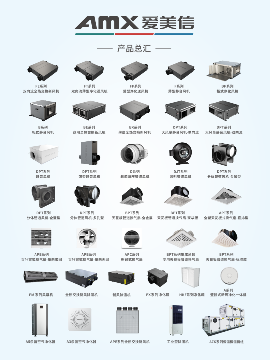 愛(ài)美信作為新風(fēng)行業(yè)領(lǐng)軍品牌企業(yè),公司產(chǎn)品主要覆蓋家用新風(fēng)系統(tǒng)、商業(yè)新風(fēng)系統(tǒng)、空氣凈化、除濕機(jī)、空氣處理機(jī)組、換氣扇、風(fēng)幕機(jī)等系列產(chǎn)品。廣泛適用于住宅、商業(yè)場(chǎng)所、工業(yè)廠房、市政基建等各個(gè)領(lǐng)域。
