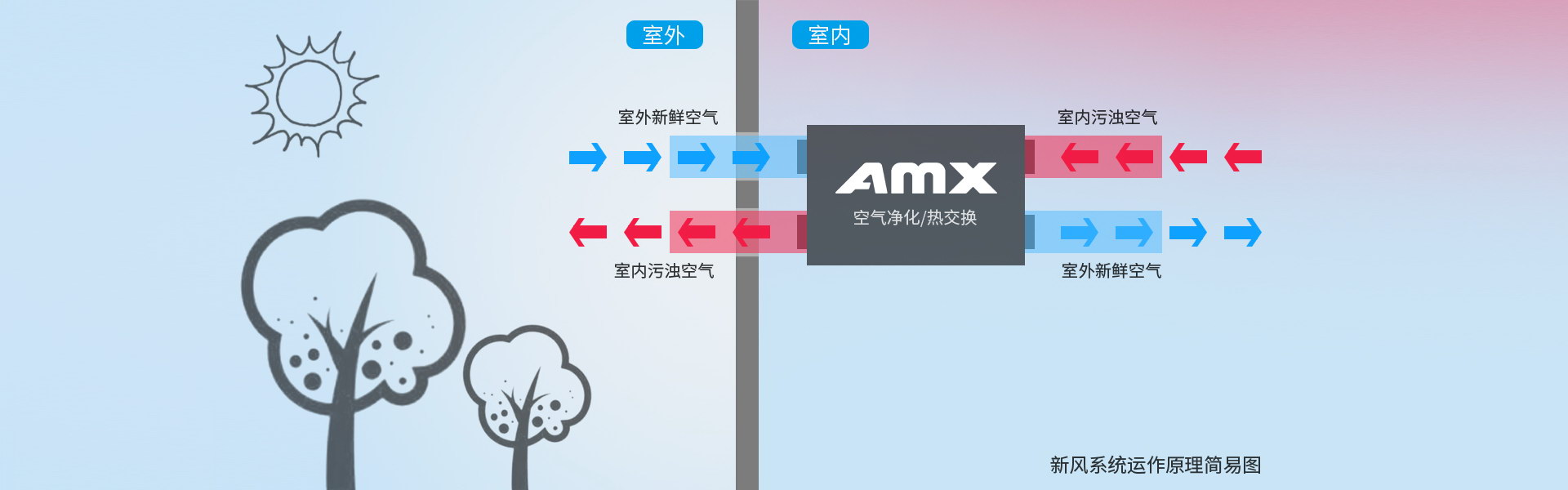 中央空調(diào)的主要功能是制冷或制熱,在于控制和調(diào)節(jié)室內(nèi)空氣溫度,最終使室內(nèi)溫度達(dá)到人體適宜、舒爽的目的。而新風(fēng)系統(tǒng)的主要功能在于通風(fēng)換氣,將室內(nèi)渾濁的空氣排出室外,再將室外新鮮空氣引進(jìn)來,從而實現(xiàn)室內(nèi)外空氣循環(huán)。